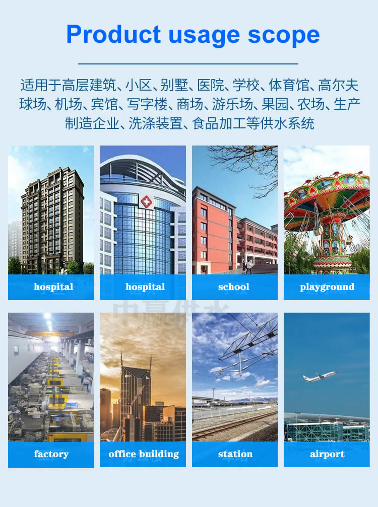 The fully automatic variable frequency constant pressure water supply pump is a type of fully automatic booster pump that is directly connected in series on the pipeline or installed on the edge of the water tank. It can automatically work and stop according to the water usage situation, and has a series of advantages such as stable pressure, cleanliness, hygiene, small size, low noise, energy saving, environmental protection, adjustable parameters, and simple use. It is an ideal water supply pump for boosting household tap water, villas, small hotels, farmhouses, small-scale water supply projects, and other areas.