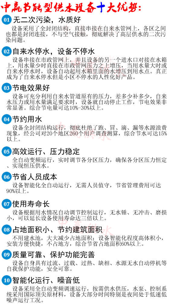 1、 設備直接串聯在自來水官網上,不用建水池,節約大量土地和資金。